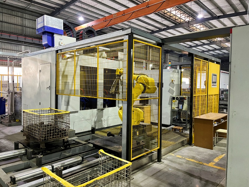 工作方式:機器人通過3D視覺無序在料框內抓料,自動上料至淬火機床,淬火后自動下料至下料框。
